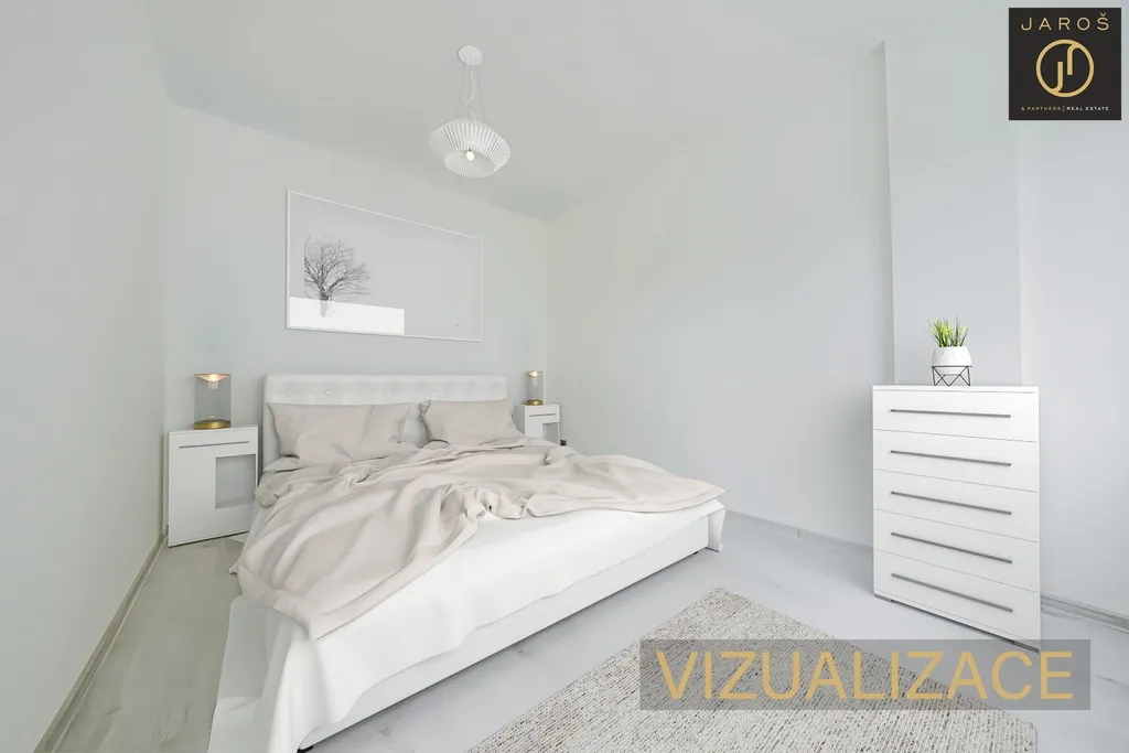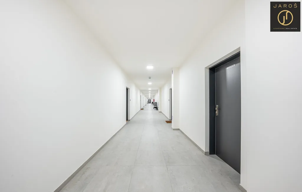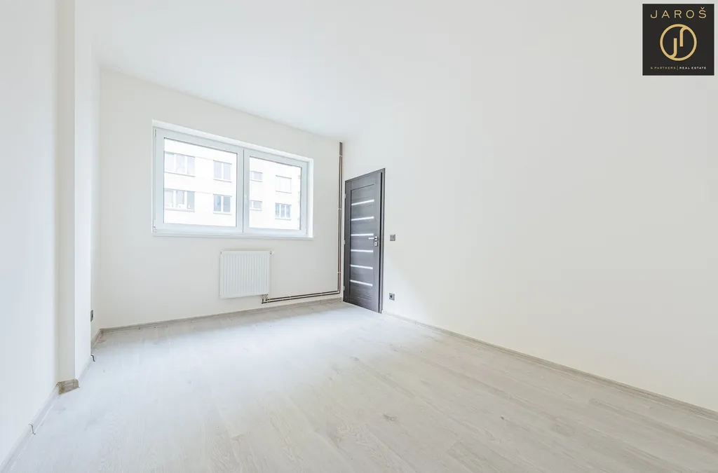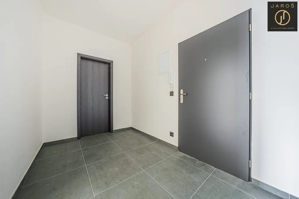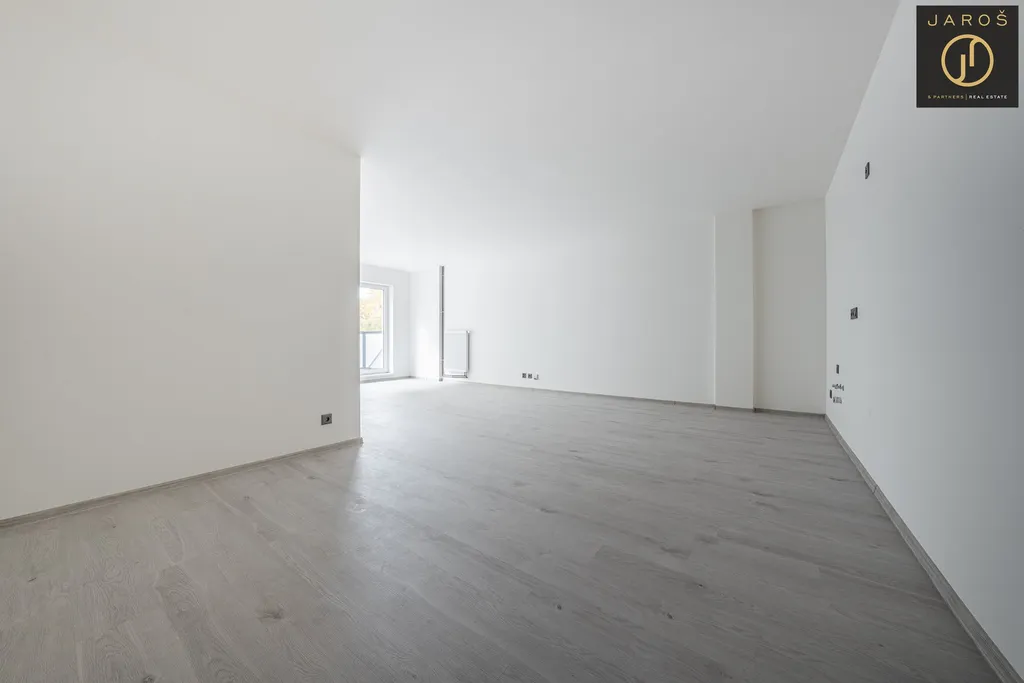 Dispozice bytu je řešena prostornou vstupní chodbou s dostatečným místem pro vestavěnou skříň, odkud je vstup do 42 m2 prostorného obývacího pokoje, kde je vše připraveno k instalaci vlastní kuchyňské linky. Z pokoje je výstup na balkon a přístup do ložnice. Do koupelny se sprchovým koutem a společnou toaletou se vchází ze vstupní chodby.
