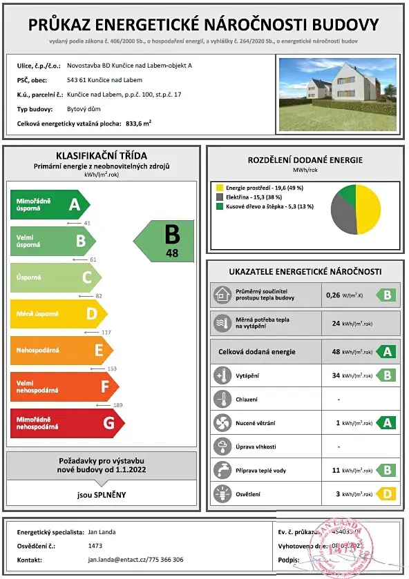 | Ukazatel energetické náročnosti | 48 kWh/m2 za rok |