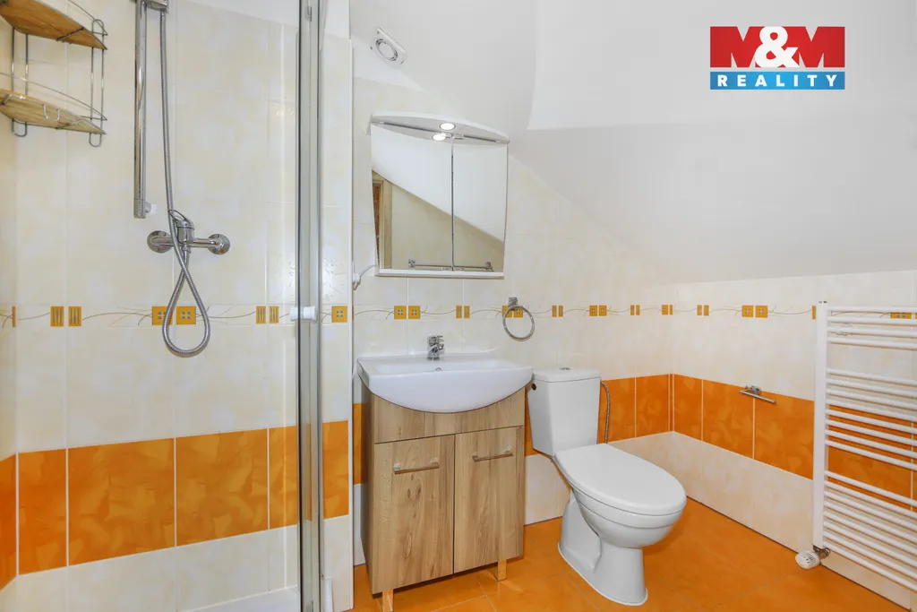 V patře je pak prostorný mezonetový byt 3+kk o ploše 83 m² s krbem, přístupem do horního podlaží, kde se nachází další pokoj, chodba a koupelna s WC. K tomuto bytu náleží také velká terasa s výhledem.
