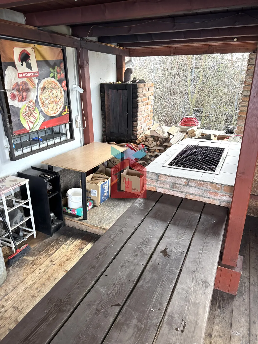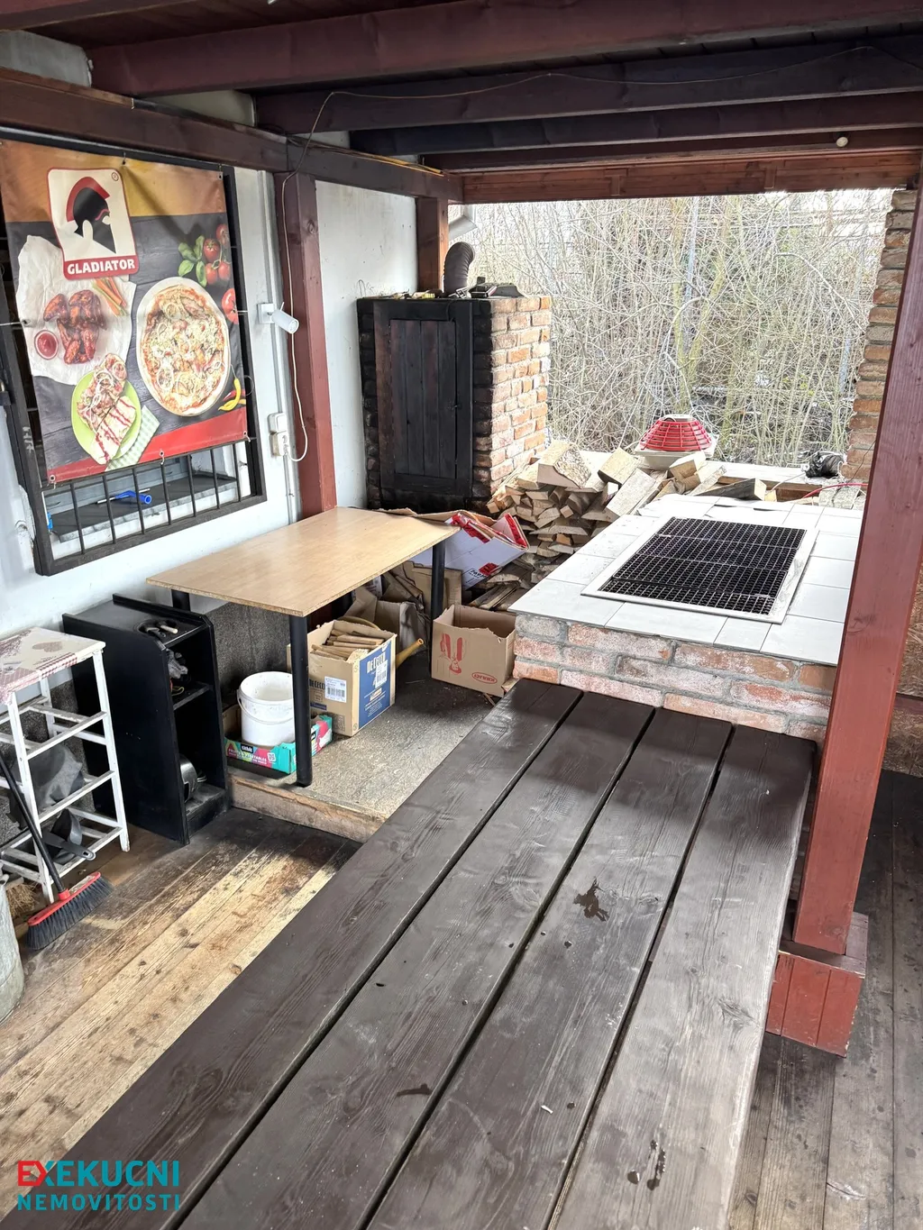 Jedná se o dřevěnou trámovou konstrukci s pultovou střechou, která navazuje na restauraci. Podlaha je dřevěná prkenná. V prostoru zastřešení se nachází venkovní zděný gril a udírna.