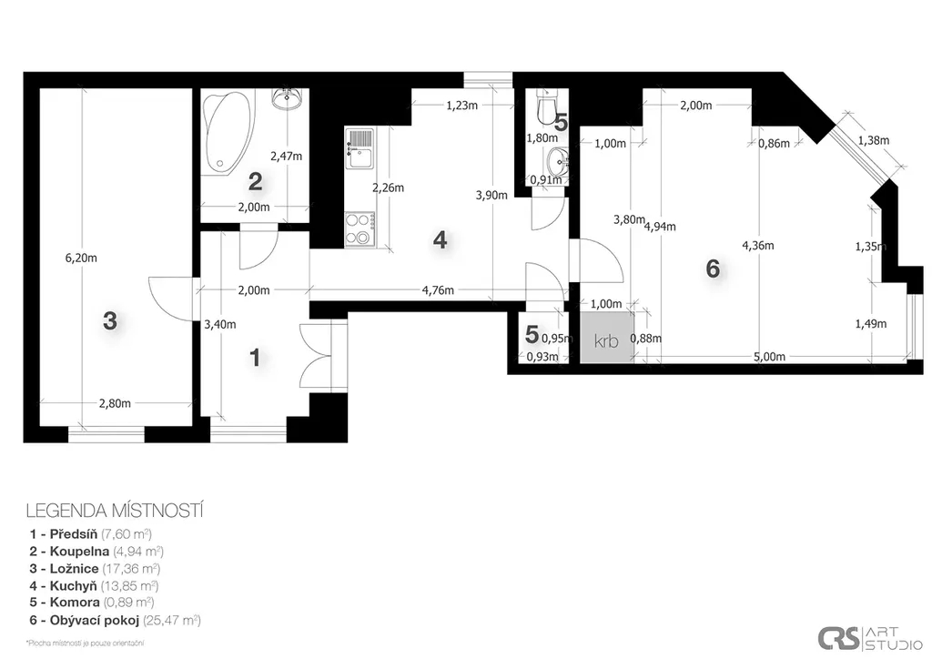 Byt v OV, 73 m2, 3.NP/ze 3.NP, prošel citlivou kompletní rekonstrukcí a plně zapadá do zdejšího koloritu. Promyšlený interiérový potencionál uspokojí i nejnáročnějšího zájemce. Dispozice bytu: vstupní hala (7,60 m2), vlevo ložnice (17,36 m2) s okny do zahrady, naproti koupelna (4,94 m2) s rohovou vanou, el. bojler na ohřev vody. Třetí vstup z haly je do kuchyně (13,85 m2) s instalovanou kuchyňskou linkou s vestavěnými elektrospotřebiči (myčka, indukční deska, trouba, digestoř, dřez s baterií). Vedle kuchyně je komora (0,90 m2) a naproti WC (1,64 m2) s umyvadlem a okénkem. Pravé křídlo bytu reprezentuje velký obývací pokoj (25,47 m2) s výhledem k Betlémskému náměstí, zde je umístěn krb. Bydlení je ideální jak pro milovníky staropražské atmosféry, tak pro ty, kteří hledají netradiční a autentické bydlení v historické památce.