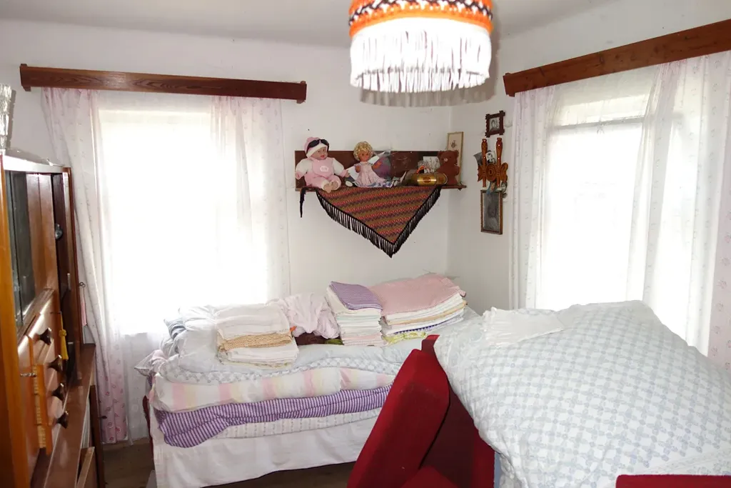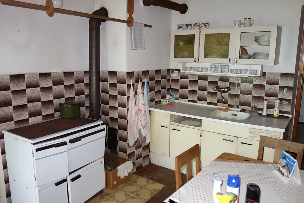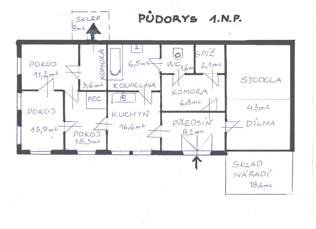 Dům má díspozici 3+1 s jednou koupelnou,samostaným WC,2xkomorou a spíží.K domu náleží sklep-8m2.Dům je dále propojen s hospodářskou částí tvořenou stodolou s dílnou a skladem nářadí.Nad celým přízemím se nachází velký půdní prostor se započatou půdní vestavbou s balkonem.