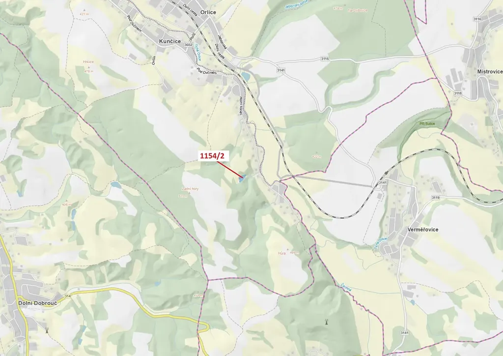 Lesní pozemek o výměře 3699 m2, parcelní číslo 1154/2, podíl 1/1, katastrální území Kunčice u Letohradu, obec Letohrad, obec s rozšířenou působností Žamberk, okres Ústí nad Orlicí, Pardubický kraj. Po těžbě.