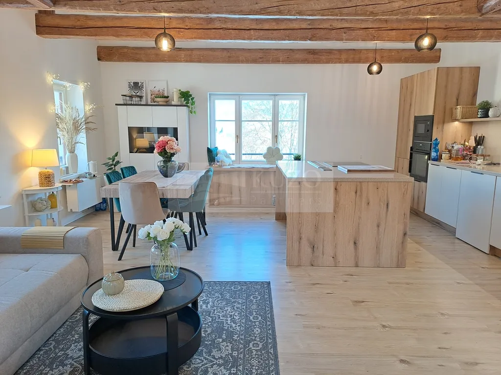 Byt, stejně tak jako celá vila o 6-ti bytových jednotkách, je citlivě zrekonstruován s důrazem na kvalitu a maximální pohodlí majitelů. Vestavěná kuchyně je od interiérové špičky na trhu, spol. Hanák, s pracovní deskou z drceného kamene, denním barem, výsuvnou digestoří, nadrozměrnou lednicí a dalšími prvky dotvářejí pocit luxusu a péče. Koupelna s vanou umožňuje relaxaci po náročném pracovním nebo sportovním dni, stejně jako posezení u litinového designového krbu v obývacím pokoji. Sedací okno zase vybízí k zasněným toulkám pohledy po krajině z tepla a pohodlí domova. Klidný nádech ložnice dovoluje majitelům plně se uvolnit a načerpat síly na další dny a výzvy. Pracovna/dětský pokoj je vybaven na míru zhotovenými vestavěnými skříněmi, také od spol. Hanák. Krásné původní masivní trámy a větší a menší okénka dodávají tomuto unikátnímu bytu zemitý a tradiční charakter.