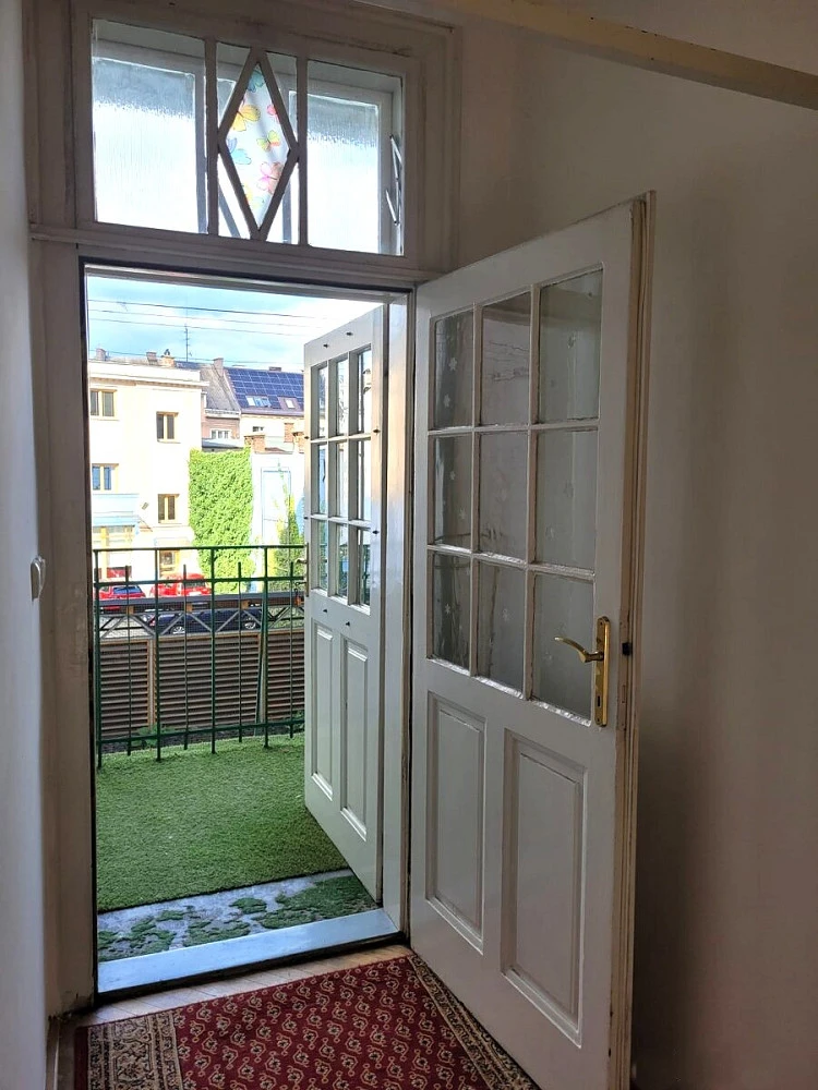 Byt se nachází v 1. patře cihlového domu s vysokými stropy. Na patře je pouze tento byt- zaručuje tak soukromí.