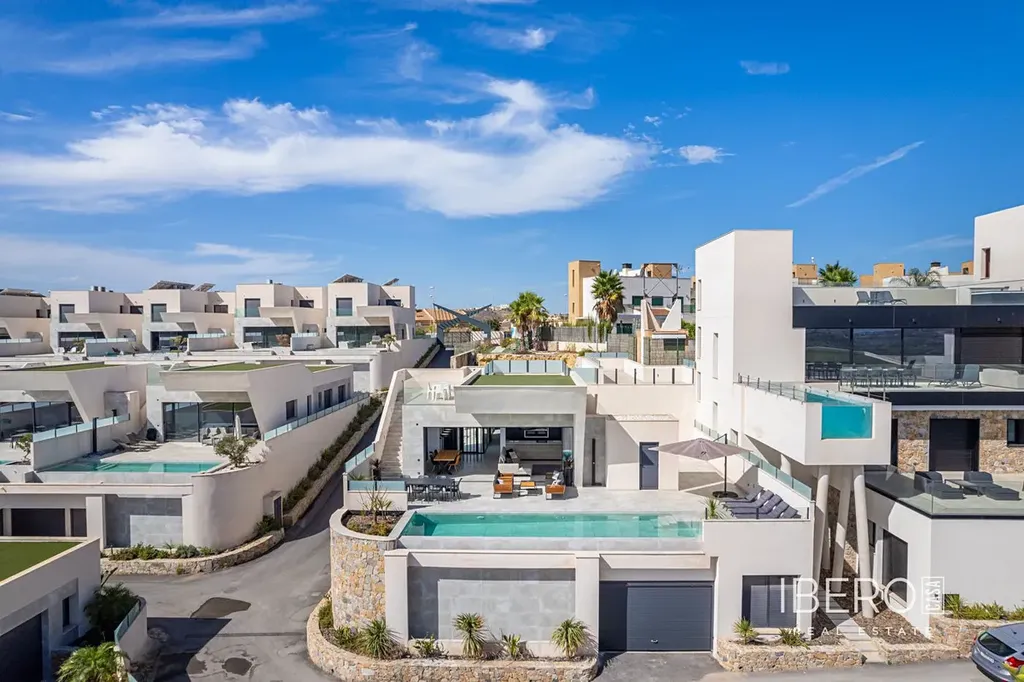 Luxusní vila s 5 ložnicemi a 6 koupelnami s výhledem v Ciudad Quesada. Krásná luxusní vila s celkovou obytnou plochou 333 m2 rozdělenou na dvě úrovně. Skládá se z celkem 5 dvoulůžkových ložnic, z nichž všechny mají vlastní koupelnu, další koupelny a toalety pro hosty. Hlavní patro se skládá ze dvou ložnic s koupelnami, toalety pro hosty a krásné otevřené kuchyně, obývacího pokoje a jídelny. V obývací části máte k dispozici velké posuvné dveře, které se zcela otevírají a poskytují skvělý prvek vnitřního / venkovního bydlení. Spodní úroveň se skládá ze tří ložnic s en-suite koupelnami, kuchyně a technické místnosti, velkého obývacího pokoje, koupelny, dvou úložných místností. Pokoje v této úrovni mají přístup na krásnou terasu. Z obývacího pokoje na této úrovni je přímý přístup do garáže a technické místnosti. Vila je vybavena centrální klimatizací (teplá/studená), podlahovým vytápěním v koupelnách, dvojitými okny a bezpečnostními dveřmi. Venkovní prostorVila stojí na krásném rohovém pozemku o rozloze 462 m2. Bazénová část je orientována na východ, což umožňuje úžasný výhled do okolí a na moře. Kolem bazénu máte k dispozici krásnou dlážděnou plochu s prostorem pro několik venkovních posezení a lehátek. Z prostoru bazénu vedou venkovní schody na velkou střešní terasu. Zde máte jednu část, která je pokryta dlaždicemi, a druhou část s umělou trávou, obě s velkým prostorem pro venkovní zábavu a s úžasným výhledem. U vchodu do domu máte další krásnou vydlážděnou zahradní plochu, která směřuje na západ. Tato oblast je ideální pro vychutnávání odpoledního/večerního slunce. Na spodní úrovni najdete velkou dlážděnou terasu s umělou vertikální zahradou. Na tuto terasu je přístup ze zahrady po venkovních schodech a také z obývacího pokoje a 2 ložnic ve spodní úrovni.