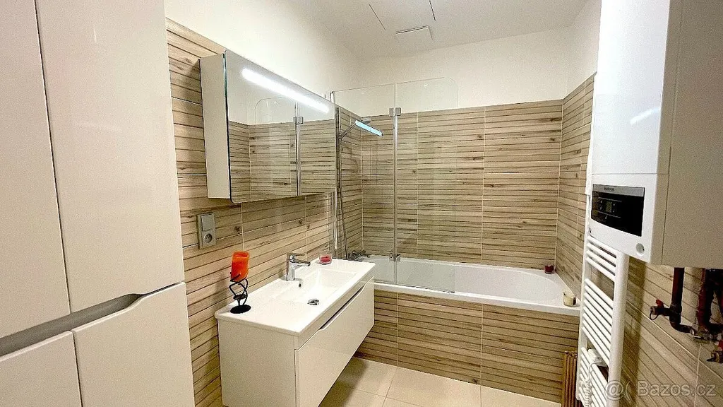 Hlavní byt o výměře 97 m² má dispozici 3+kk. Nabízí dvě prostorné ložnice a šatnu, světlý obývací pokoj s kuchyňským koutem, elegantní koupelnu s vanou, toaletou a vyhřívaným věšákem na ručníky. V bytě je instalován bojler s možností online ovládání, což zajišťuje komfort a efektivní provoz. Obě ložnice mají vlastní vstup z chodby, ale jsou zároveň navzájem propojeny spojovacími dveřmi. Díky tomu je lze využívat buď jako dvě zcela oddělené místnosti – například ložnici a dětský pokoj – nebo je v případě potřeby otevřít a spojit do jednoho velkorysého prostoru. Hlavní ložnice má navíc vlastní šatnu, vybavenou praktickými vestavěnými skříněmi. Kuchyň je osazena kvalitními vestavěnými spotřebiči – indukční varnou deskou, elektrickou troubou, myčkou nádobí a kombinovanou lednicí s mrazákem.