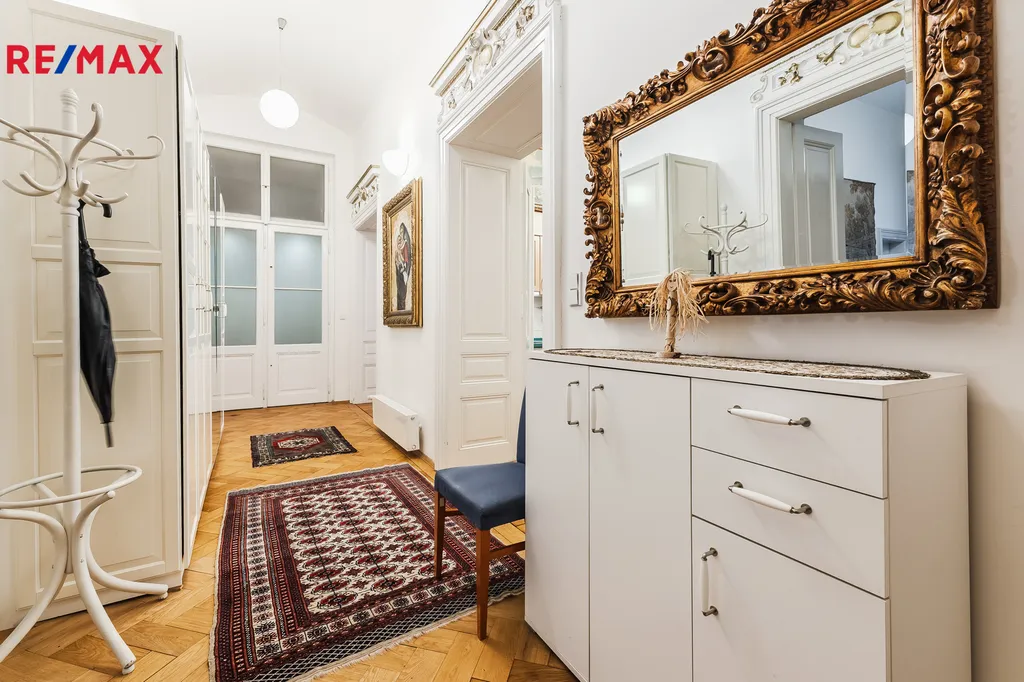 Interiér bytu je vybaven vkusným historickým nábytkem, který vytváří jedinečnou atmosféru a styl připomínající šlechtické městské rezidence. Velkorysá dispozice nabízí samostatné vstupy do všech místností z prostorné centrální chodby, což zajišťuje pohodlí a soukromí pro vícečlennou domácnost, případně i kombinaci bydlení a reprezentativního zázemí.
