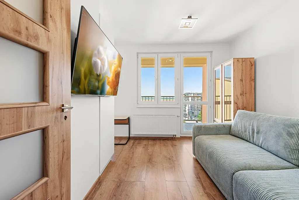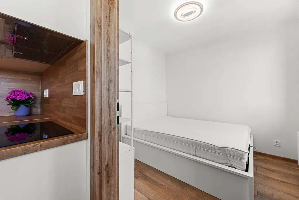 Byt se skládá z obývacího pokoje s kuchyňským koutem, ze kterého je vstup na prostorný balkon. Kuchyňská linka je vybavena vestavěnými spotřebiči – elektrickou troubou, varnou deskou, digestoří, myčkou na nádobí a lednicí s mrazákem.