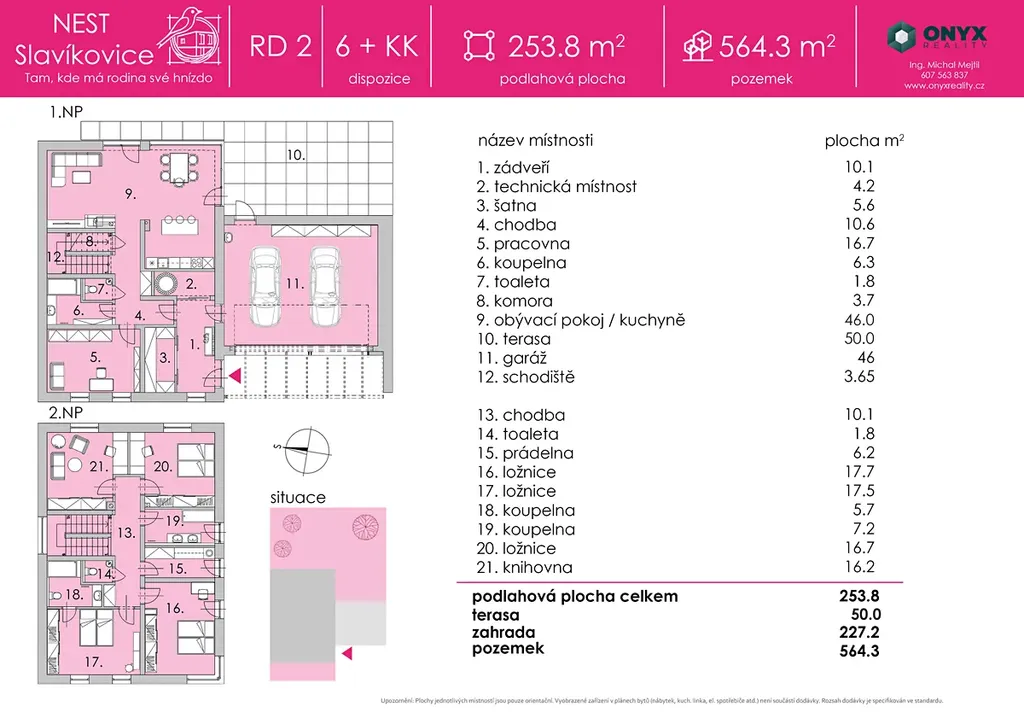 Celková užitná plocha domu činí 253,8 m². Součástí nabídky je terasa ze sibiřského modřínu o velikosti 50 m² a na ni navazující zahrada o výměře 225,5 m². Pozemek má celkovou rozlohu 564 m².