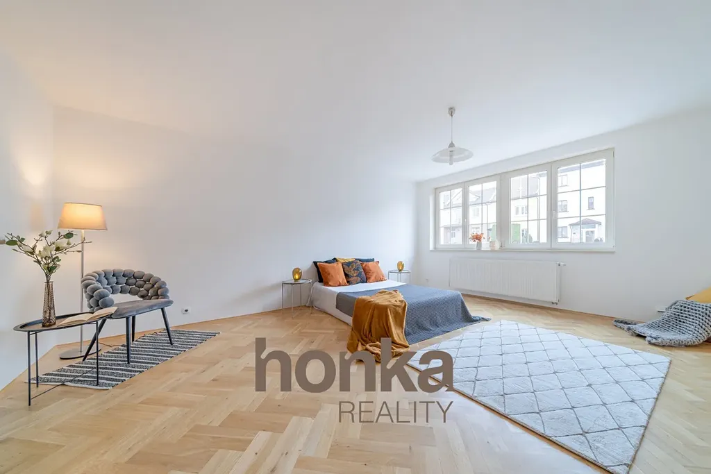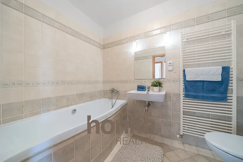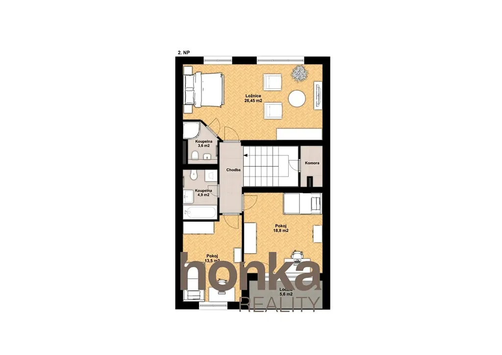 2. patro: Ložnice 26,45 m² s vlastní koupelnou 3,6 m², další dva pokoje 13,5 m² a 18,8 m², koupelna s WC a bidetem 4,9 m², lodžie 5,6 m²