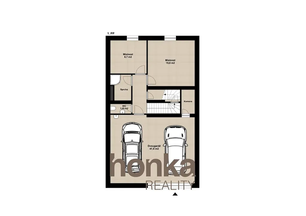 Suterén: Dvougaráž 41,8 m², místnosti 8,7 m² a 15,6 m², WC (1,65 m²), další úložné prostory