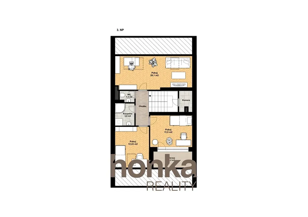 3. patro: Tři pokoje 20,1 m², 11,5 m², 12,23 m², koupelna 3,9 m², samostatné WC 1,5 m², střešní terasa 5,2 m²