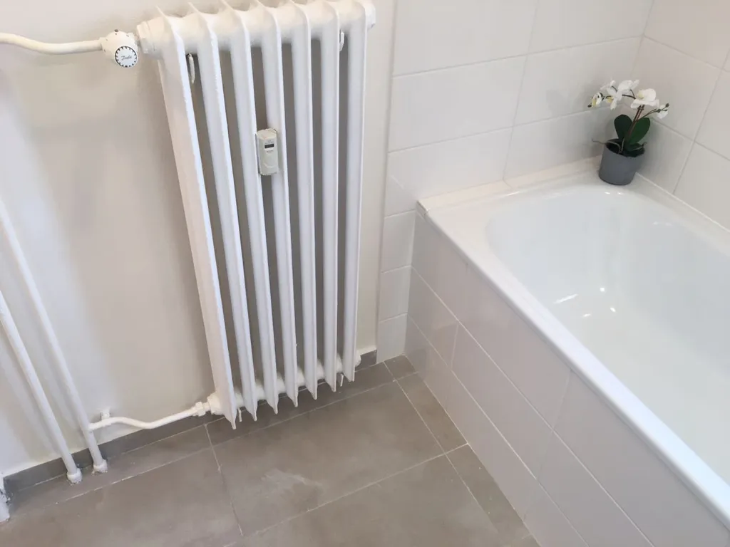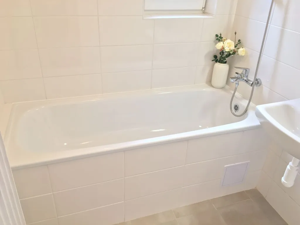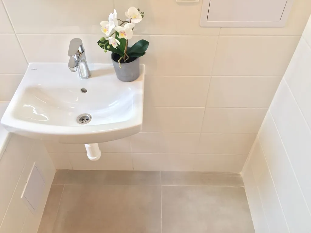 Koupelna s vanou a umyvadlem a možností připojení pračky, toaleta je odděleně. Kuchyňská linka je vyrobena na míru a je opatřena elektrickým sporákem a elektrickou troubou.