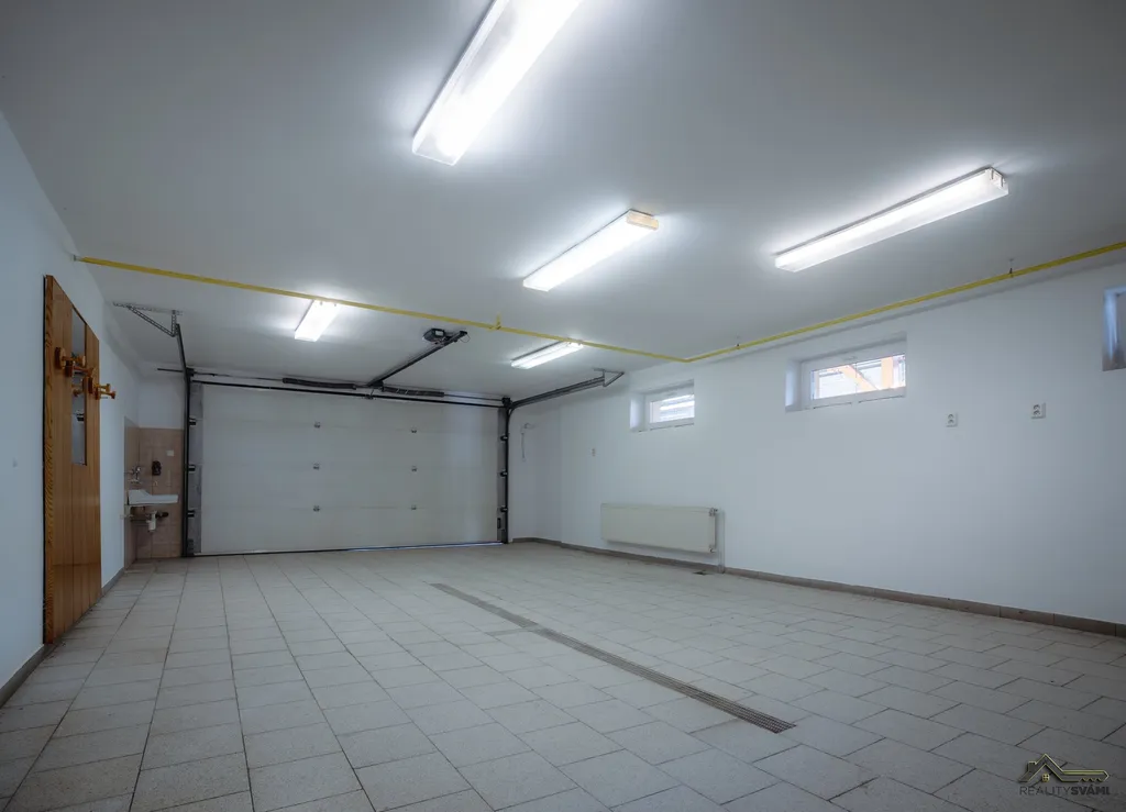 V 1NP najdeme prostornou vstupní halu, ze které pak vstupujeme do prádelny, samostatné toalety, velké garáže, kde můžeme umístit až 3 auta a dále následuje menší hala s krbem, ze které se dostaneme např. do pánského pokoje, koupelny, kde je umístěna vířivka, sprchový kout a z této koupelny můžeme vyjít přímo na zahradu. Dále se z této haly přes francouzská okna vychází na zahradu. Z tohoto patra lze právě vytvořit prostor pro podnikání a lze tady vytvořit recepci.