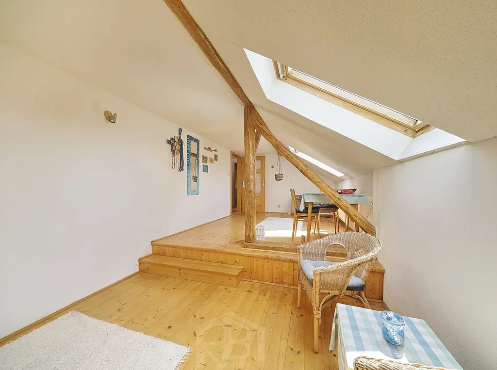 V podkroví jsou 3 prostorné pokoje, koupelna, WC a šatna. Za domem je menší uzavřený dvorek, před domem je předzahrádka a pár kroků od domu oplocená zahrada 182 m2, v níž je přístřešek na nářadí a skleník.