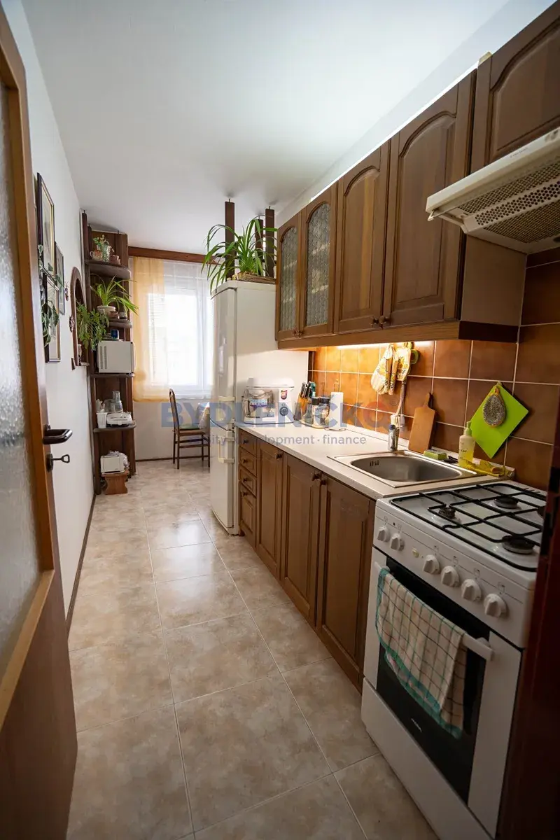 Dispozice: 2 samostatné pokoje: pokoj č.1 (obývák) – 20,7 m2 se vstupem na balkon (2,27 m2), pokoj č.2 (ložnice) – 8,63 m2 a kuchyně s jídelním koutem – 12,61 m2. Dále je zde zděná koupelna s vanou 3 m2, WC 1 m2 a prostorná předsíň 6,6 m2. Velkou výhodou je také komora (šatna) o velikosti 2,87 m2, která nabízí dostatek úložného prostoru, který je v těchto bytech důležitý.