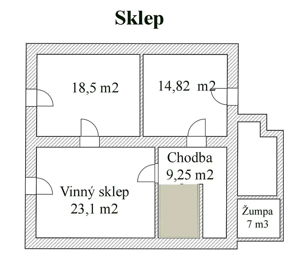 Prostorný sklep nabízí dostatek úložných prostor a jednu stylovou místnost využívanou jako vinný sklep s posezením.
