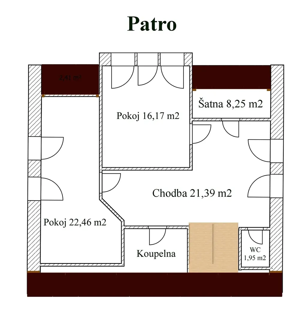 • Druhá ložnice (22,46 m²) – možnost rozdělení na dvě samostatné místnosti