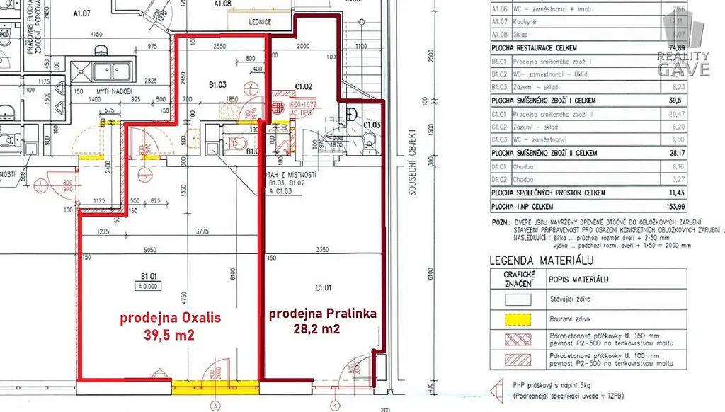 Velikost prostor Oxalis: Prodejna 29,1 m² + sklad a sociální zařízení 10,42 m² (celkem 39,5 m²)