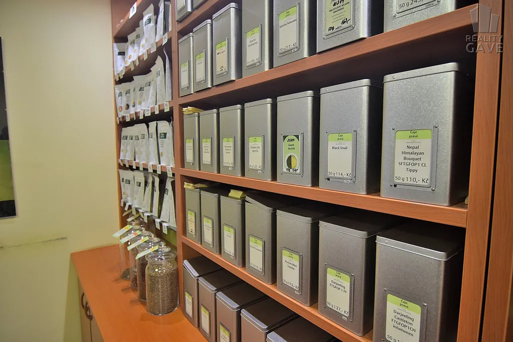 - regálové a pultové vybavení pro maloobchodní prodejny s čajovým sorimentem