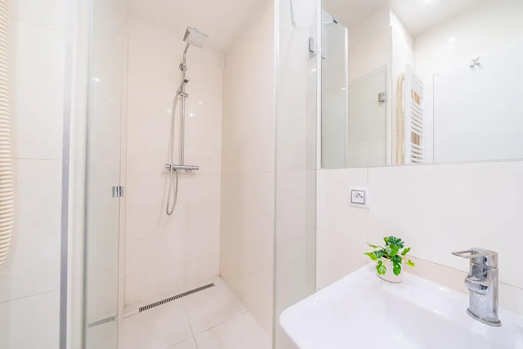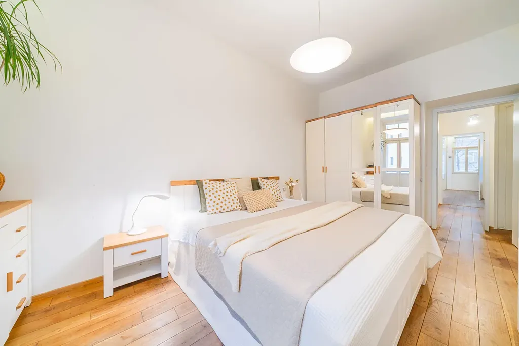 Na severovýchodní straně bytu je samostatná ložnice s kumbálem a vstupem na balkon. V propojovací vstupní chodbě najdeme koupelnu s vanou a sprchovým koutem, na druhé straně potom samostatnou toaletu. Zbytek prostoru je chytře rozvržen tak, aby poskytoval maximální komfort a praktičnost. Byt disponuje balkonem o velikosti 2 m², který je ideálním místem pro relaxaci s výhledem do klidného dvora. Součástí bytu je také sklep o rozměrech 2 m², který nabízí další úložný prostor.