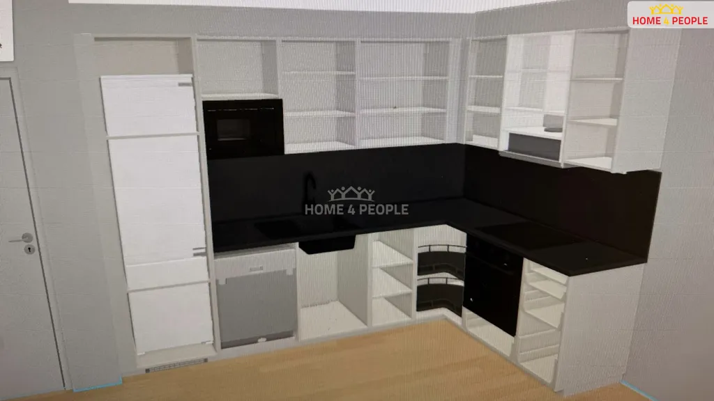 V bytě bude kuchyň z IKEA s vestavěnými spotřebiči. Myčka, lednice, mikrovlnka, digestoř. Vizualizaci najdete v galerii.