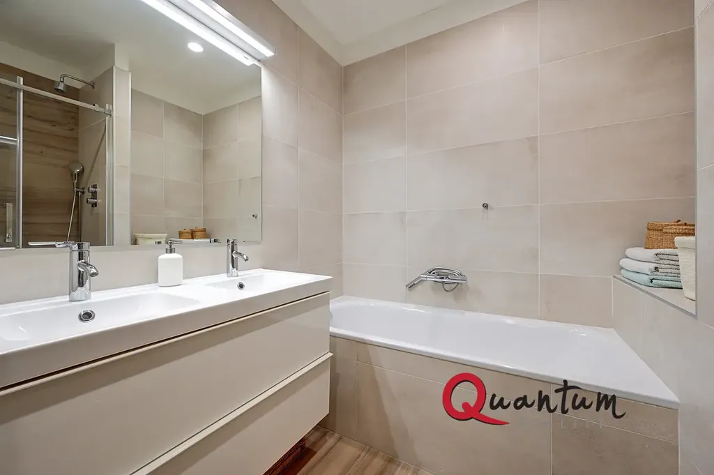 Byt disponuje prostorným obývacím pokojem spojeným s jídelním prostorem a velkorysou kompletně vybavenou kuchyní (90 cm indukční varná deska, americká lednice, myčka, mikrovlnka), což vytváří skvělý prostor pro setkávání s rodinou a přáteli. Obě ložnice orientované do vnitrobloku a zeleně Vám poskytnou komfortní soukromí a relaxaci. Koupelna je vybavena sprchovým koutem, vanou a toaletou.