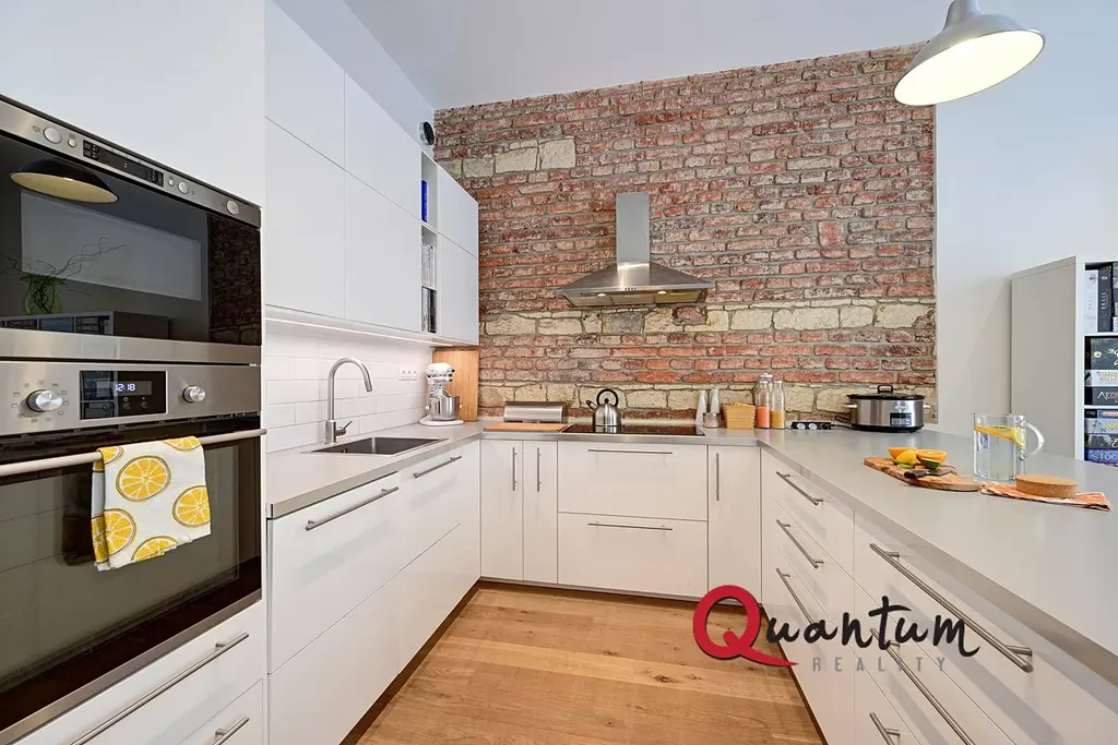 Při vstupu do bytu Vás nadchne krásná kombinace dřevěných podlah z běleného dubu a vysokých klenutých stropů a bílých dveří, což dodává bytu charakter. Jednoduchost bílé barvy a čistoty interiéru tvoří příjemnou spojovací linku tohoto bytu. Velká okna zajišťují dostatek přirozeného osvětlení.
