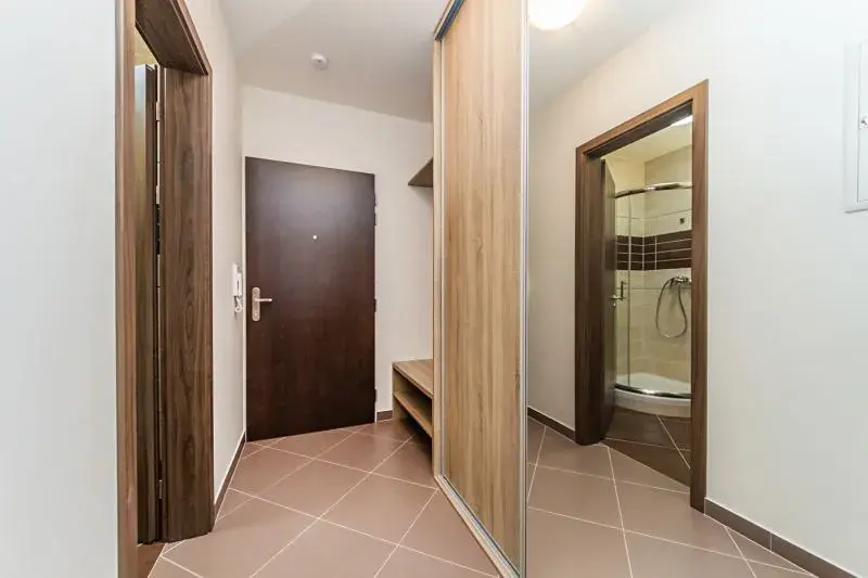 Byt je zařízený kuchyňskou linkou se sklokeramickou varnou deskou, horkovzdušnou troubou, lednicí a myčkou, koupelna se sprchovým koutem a WC, v předsíni vestavěná šatní skříň.