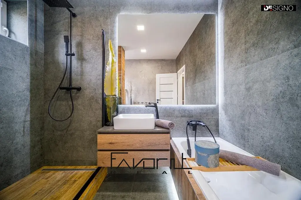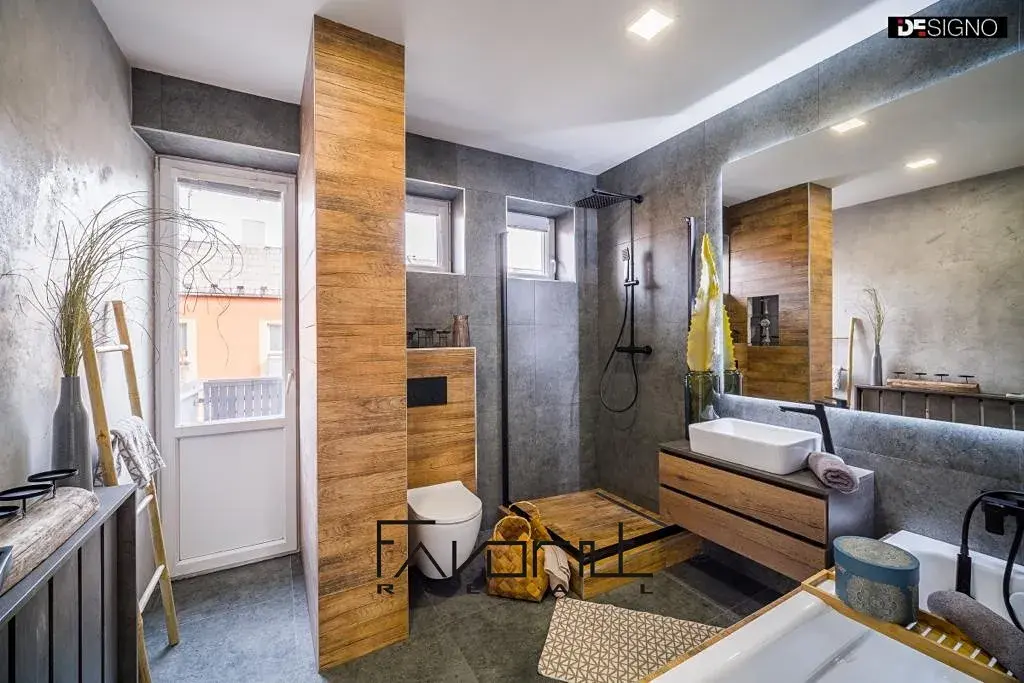 • koupelna s vanou, sprchovým koutem, designovým osvětlením a novou sanitou