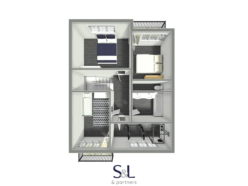 V přízemí nalezneme kuchyň, chodbu, toaletu, prostorný obývací pokoj a jídelnu, ze které se dostaneme na terasu s krásným výhledem do zeleně. V patře potom ložnici, koupelnu, dva balkóny a tři další pokoje, které můžete využít dle Vaší potřeby.