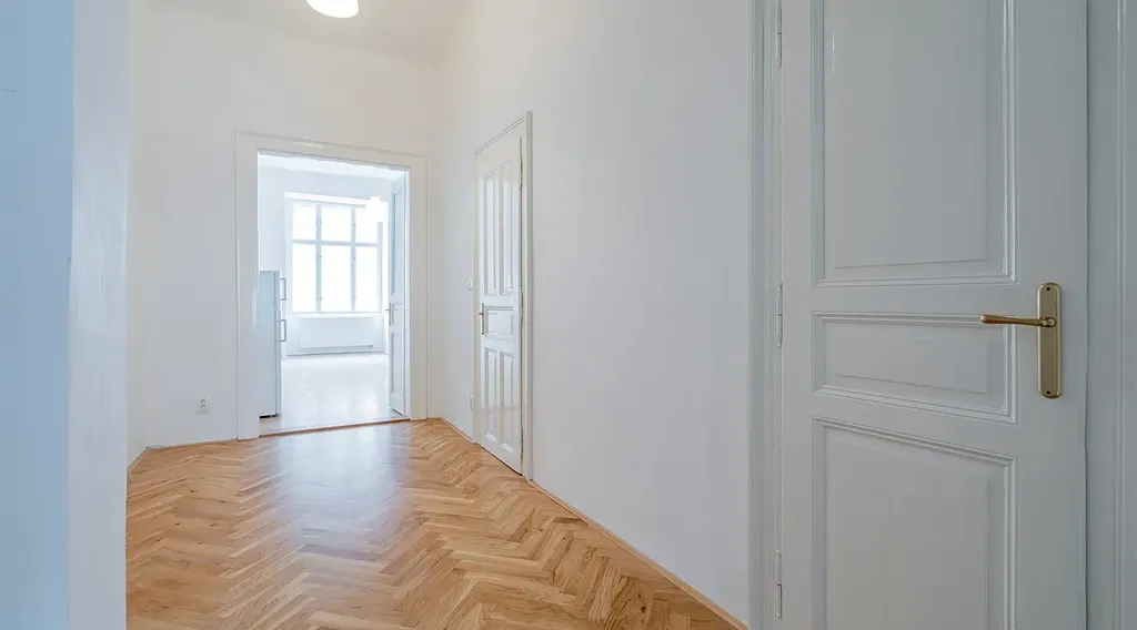 Byt se pyšní vysokými stropy, velkými okny, díky kterým je zde po celý den dostatek světla, a původními udržovanými parketami, které interiéru dodávají elegantní atmosféru typickou pro Vinohrady.