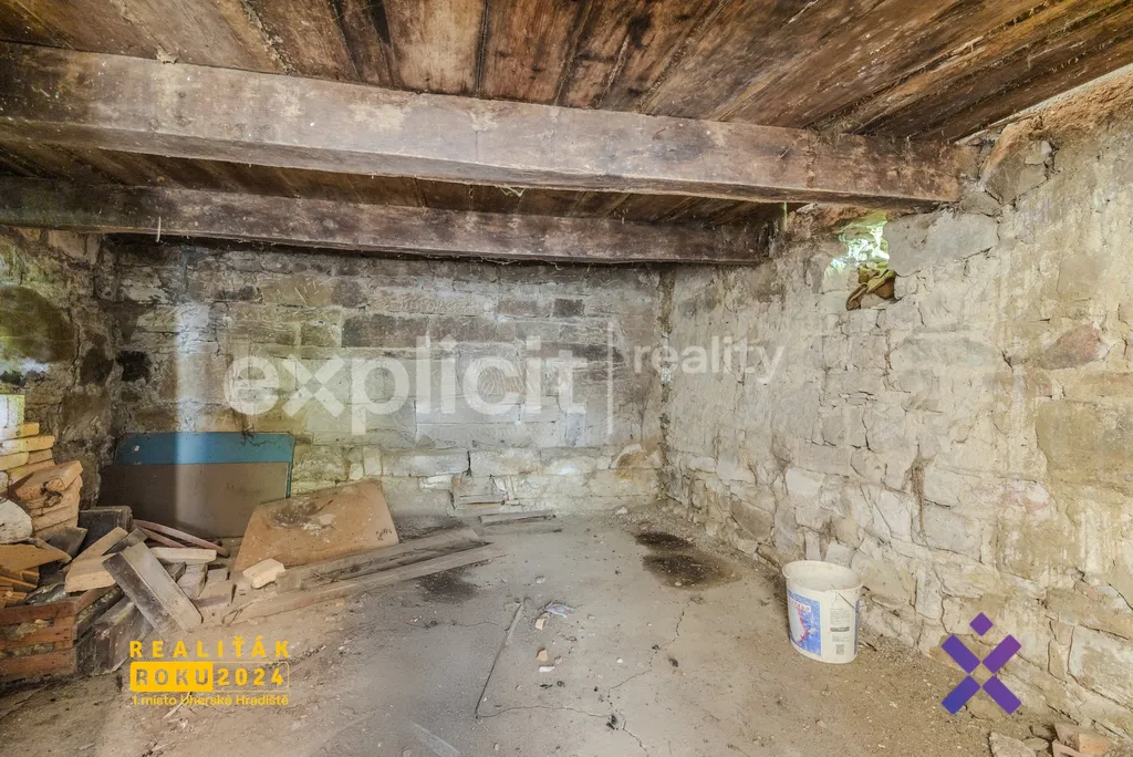 - starší dům o dispozici 1+kk – hlavní místnost 35 m², dále sklep14 m² a komora 20 m², jedno podlaží