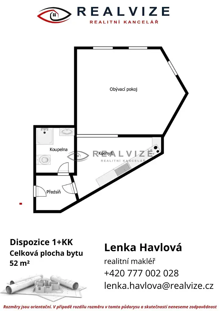 Pronájem zděného bytu 1+kk o výměře cca 52 m2 v ulici K.V. Raise, Č. Budějovice. Byt je v prvním patře, orientovaný na jihozápad. Kuchyň s kuchyňskou linkou a spotřebiči (vestavěná elektrická trouba, dvouplotýnková indukční deska, myčka, digestoř). V koupelně je sprchový kout, umyvadlo, WC, přívod na pračku je v předsíni. Podlahy - plovoucí, dlažba. Vytápění a ohřev vody novým kondenzačním plyn. kotlem, TV anténa, internet smlouva na nájemce. Max. 2 osoby, nekuřáci. K bytu náleží sklep na patře. Měsíční nájemné 11 200,-Kč + 500,-Kč/1 os. (záloha na vodu) + elektřina a plyn bude přepsán na nájemce (3 000,-), 11 200,-Kč vratná jistota, 13 552,-Kč provize RK. Volné od 1.1.2026.