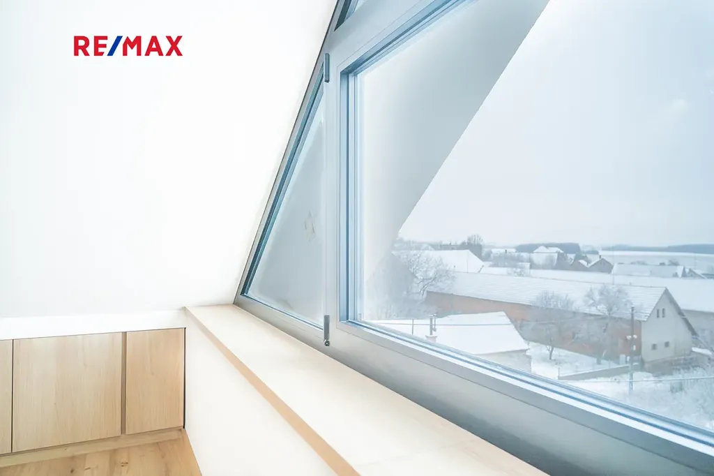 V horním patře se nachází velkoryse řešená ložnice s pracovnou, jejímž největším benefitem je opravdu unikátní panoramatický výhled do krajiny. Jde o prostor, který nabízí dokonalé zázemí pro odpočinek i práci z domu — inspirace je tady doslova na dosah ruky.
