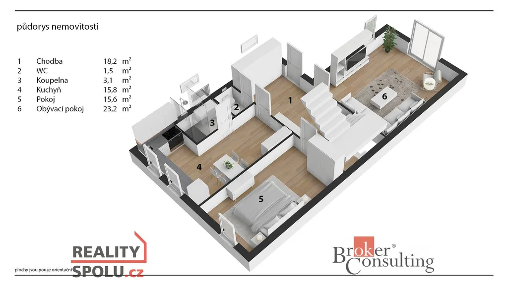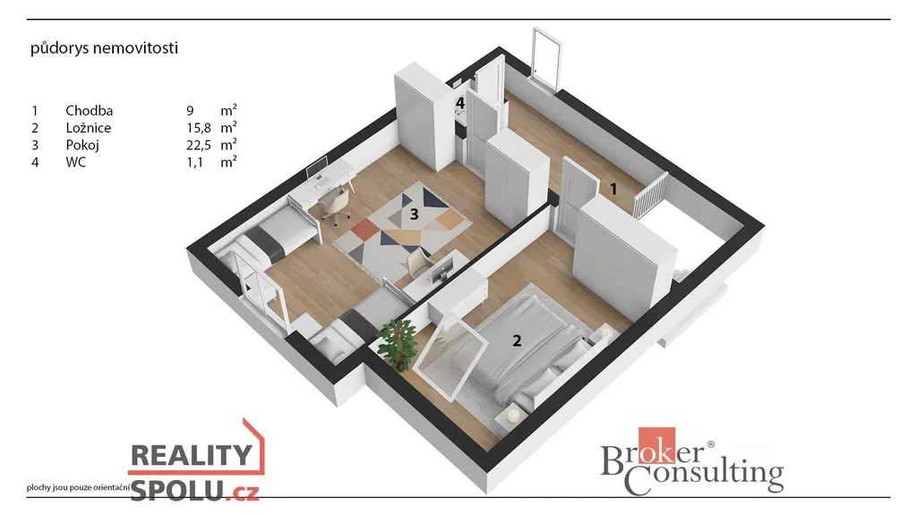 Vizualizace v inzerci slouží pouze pro představu možného zařízení. Dům se prodává tak, jak je zachycen na aktuálních fotografiích.
