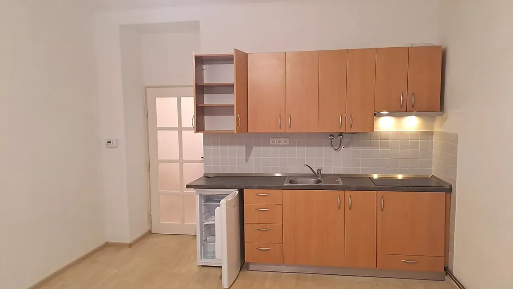 Nabízíme k pronájmu nově zrekonstruovaný , částečně zařízený byt ( kuchyňská linka ) 1+kk, 27m2. Je umístěn v suterénu cihlového domu, s plnohodnotným oknem orientovaným do vnitrobloku ( JZ) . Dispozičně je byt rozdělen na předsíň ( 4,9m2), pokoj s kuchyňským koutem (19m2) a koupelnou s WC (3m2) . Byt je po kompletní rekonstrukci . Vytápění je řešené el. kotlem, na míru zhotovená kuch. linka je osazena novými elektrospotřebiči (sklokeramická deska, digestoř a lednice). Jde o útulný , světlý byt ve vyhledávané lokalitě. Koupelna a WC jsou společné. K dispozici je sprchový kout, pračka a topný žebřík. Voda je řešena z el. bojleru, vytápění el. kotlem. K bytu patří velký sklep 3m2. Velkou výhodou je možnost užívat malý zelený vnitroblok. Lokalita má veškerou občanskou vybavenost. Pro více informací kontaktujte přímo makléře