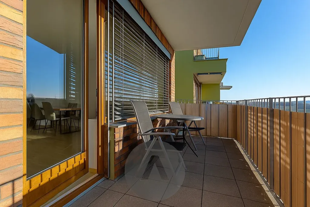 Hlavní obytná část je orientovaná na jih a díky velkým oknům působí po celý den světlým a příjemným dojmem. Kuchyňská část s čistými liniemi přirozeně navazuje na jídelnu i obývací prostor. Balkon o velikosti 9 m² má charakter menší terasy a poskytuje klidné posezení s výhledem do upraveného vnitrobloku.