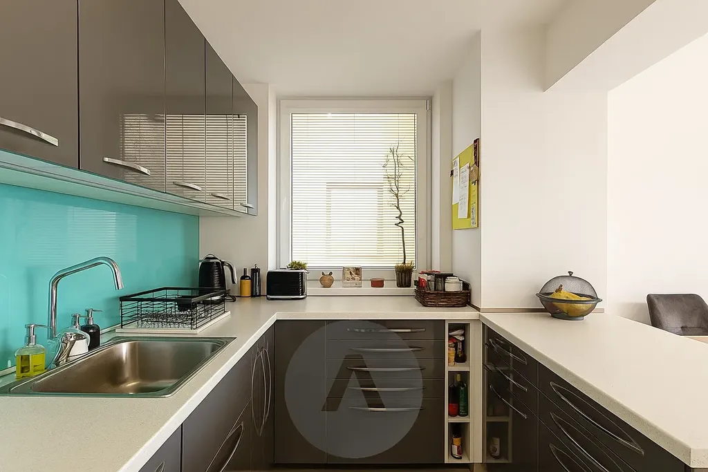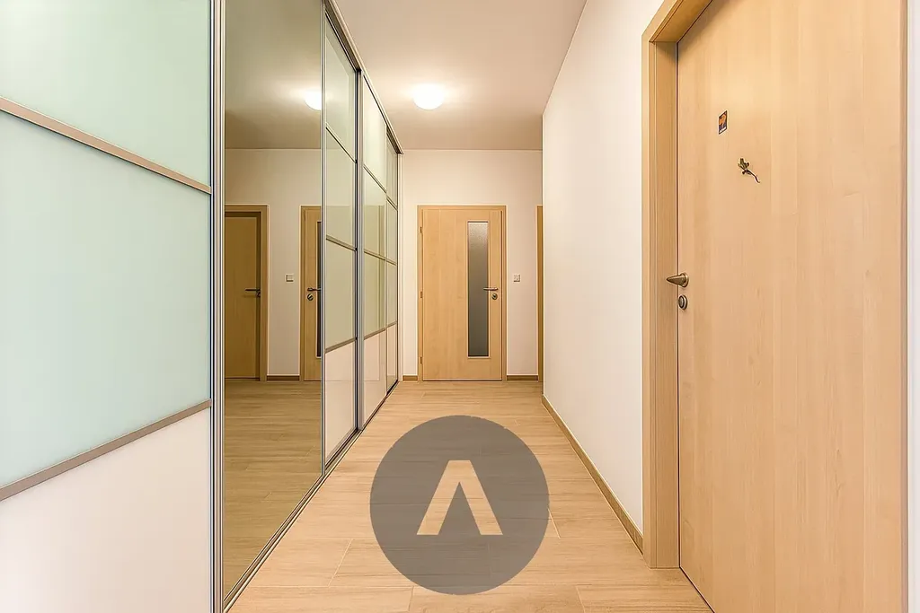 Byt se nachází v 5. NP moderního cihlového domu s výtahem. Už při vstupu je patrné, že dispoziční řešení bylo navrženo s důrazem na eleganci a funkčnost. Interiér je vzdušný, klidný a nabízí nadstandardní množství úložných prostor.