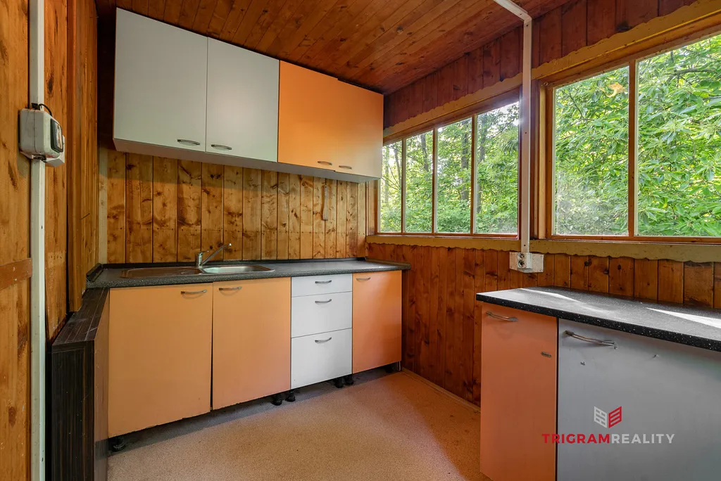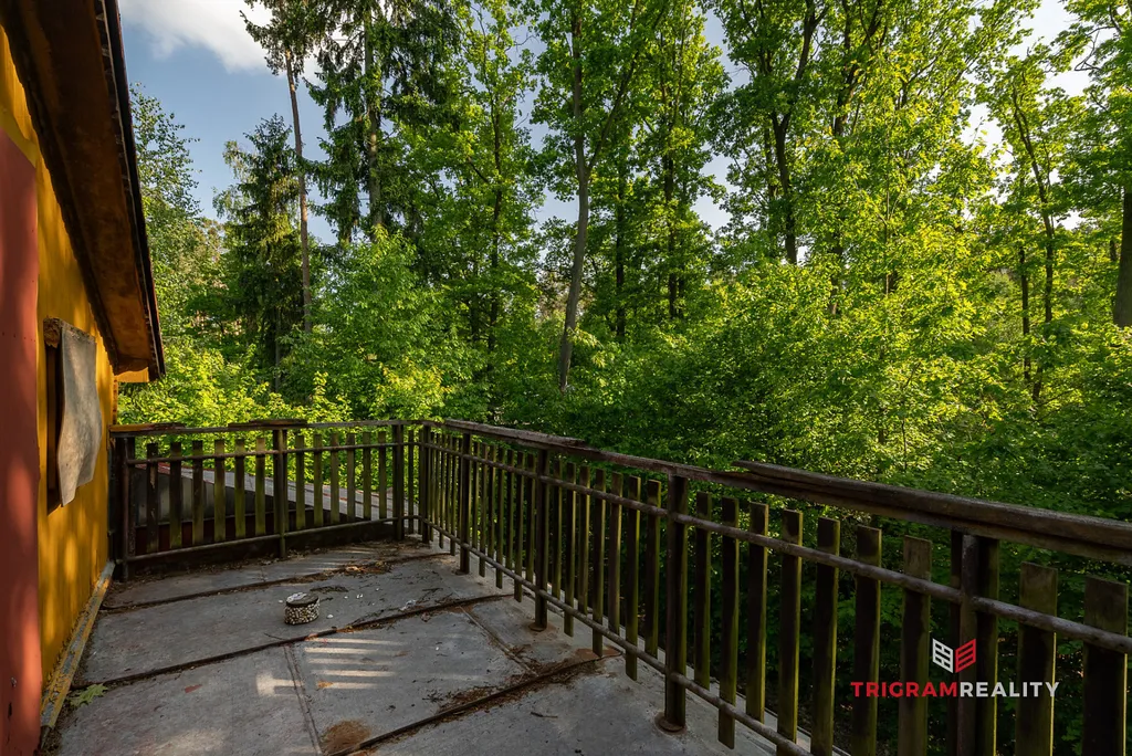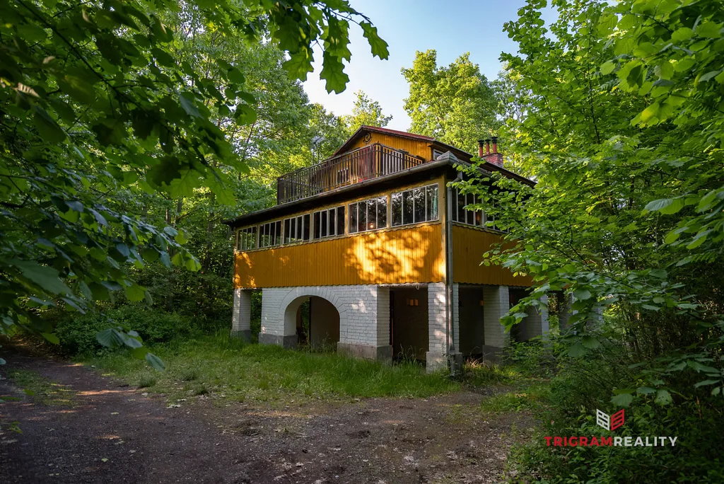 Na rozlehlém zalesněném pozemku 1544 m² stojí rekreační chata o užitné ploše 145,5 m² + balkon 12 m².