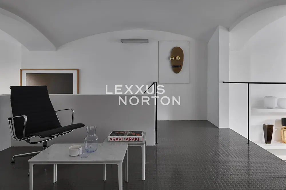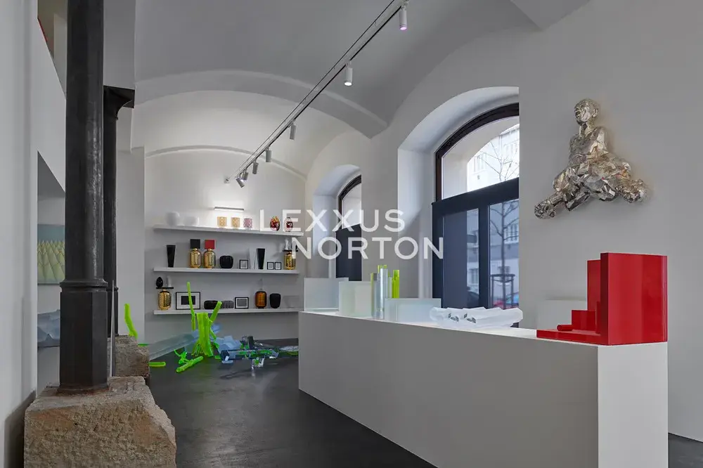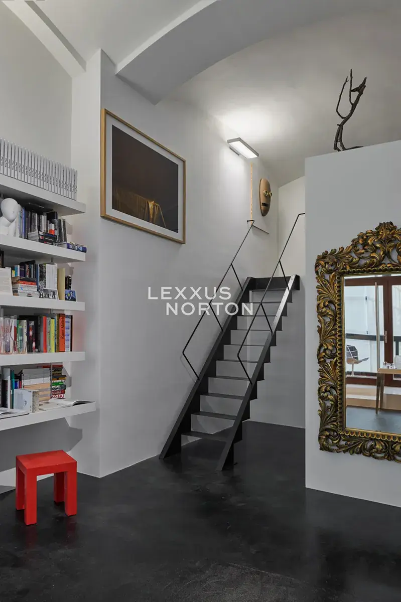 Interiér podtrhují zakázkové ocelové prvky, například sloupy, schodiště a designové kusy značky Vitra. Prostor se díky své velikosti, výšce a dispozici výborně hodí nejen jako ateliér či galerie, ale také jako reprezentativní kancelář, butik, designový showroom, luxusní obchodní jednotka nebo komorní kavárna.
