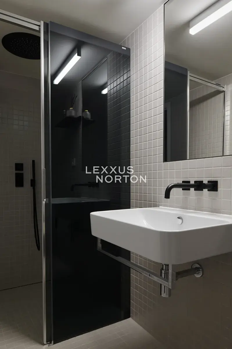 Prostor působí elegantně a nadčasově díky bílým klenbám a stěnám. Charakter doplňuje betonová podlaha s jemným mramorovaným efektem, která prostoru dodává osobitost a profesionální výraz. Osvětlení zajištuje kvalitní liniový systém iGuzzini zavěšený na laně, jenž zachovává čistotu historických kleneb a poskytuje ideální světelné podmínky.