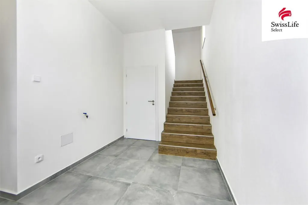 Ve spodní části domu najdete rozlehlý obývací pokoj s kuchyňským koutem ve tvaru U, součástí je varná deska a trouba (nejsou ještě zabudované), dále dvě prostorné ložnice a moderní koupelnu s vanou, ze které je vstup na WC.