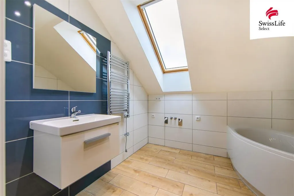 Horní byt má tři ložnice, obývací pokoj s prostorným kuchyňským koutem, koupelnu s vanou a sprchovým koutem a samostatné WC.