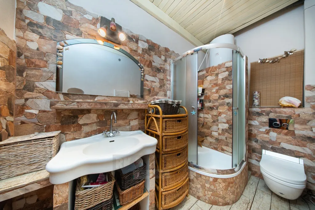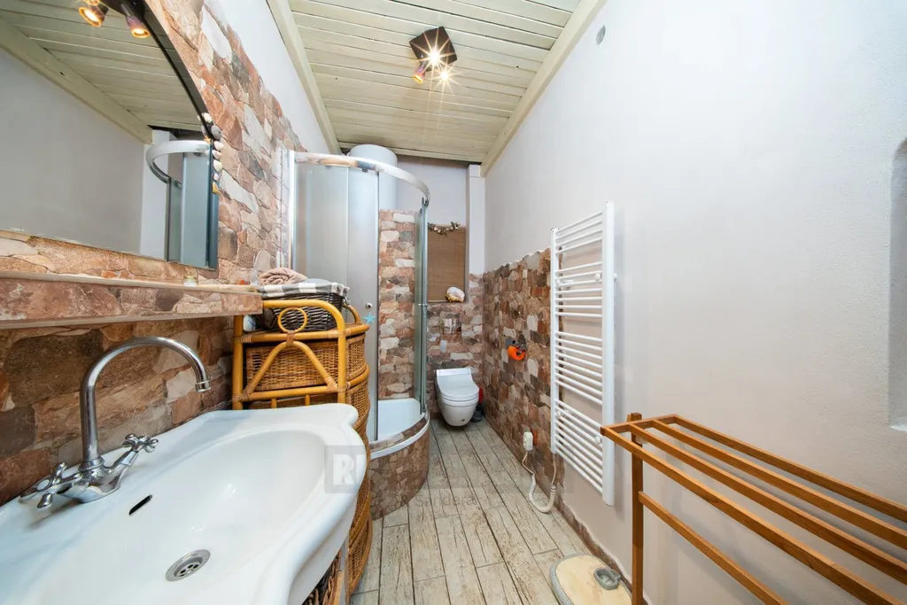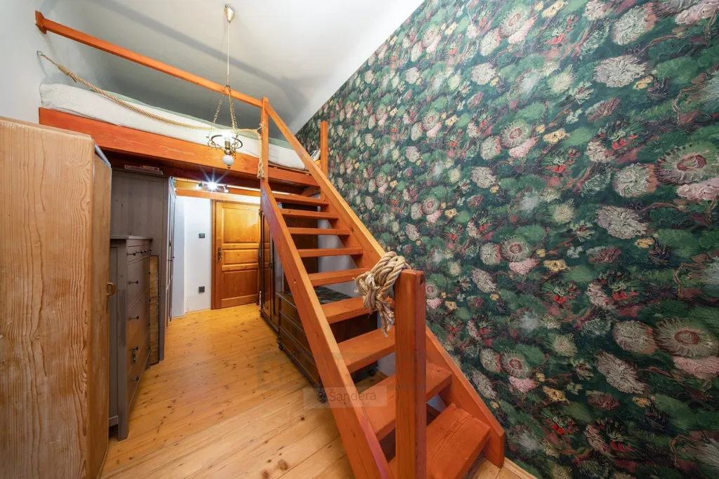 Koupelna nabízí sprchový kout, toaletu a umyvadlo s obkladem v dekoru kamene. V obou obytných pokojích jsou díky vysokým stropům vybudované dřevěné vestavby pro ložnici, které skvěle šetří prostor. Jedna ložnice disponuje také praktickým příručním skladem.
