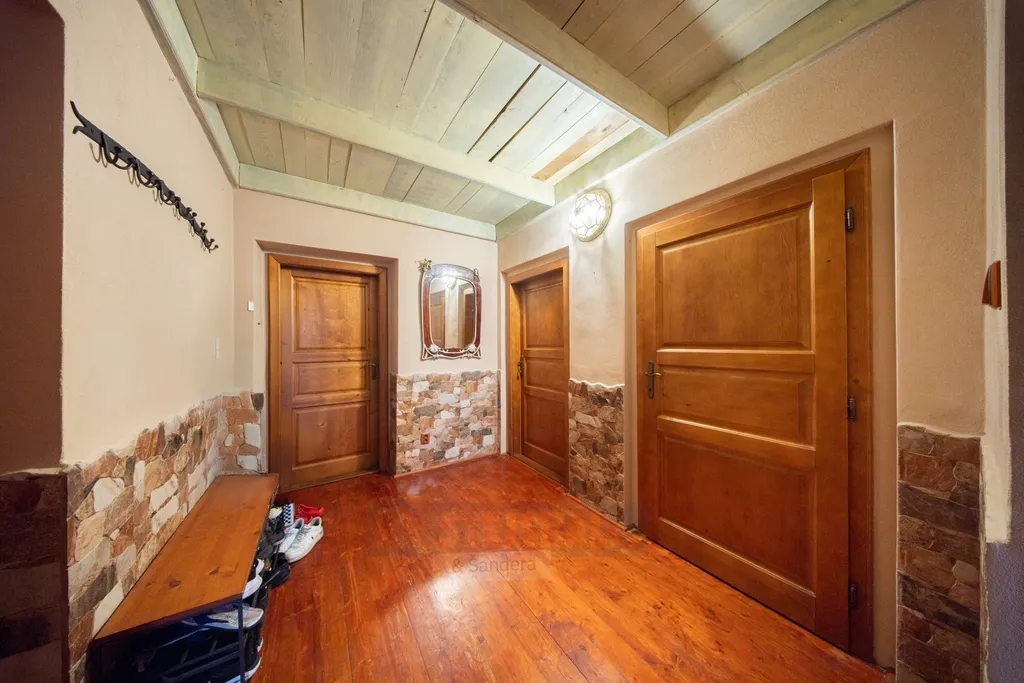 Po vstupu vás uvítá prostorná předsíň s dostatkem místa pro šatní skříně i botník. Z centrální chodby je vstup do všech místností. Velmi prakticky řešená obývací část kombinuje kuchyň ve tvaru L a prostorný obývací pokoj, který pojme jídelní kout i pohodlné posezení. Kuchyňská linka je doplněna stylovým obkladem a kompletně vybavena spotřebiči (myčka, trouba, plynový sporák). Dominantou obývacího pokoje je krásně obložený krb.