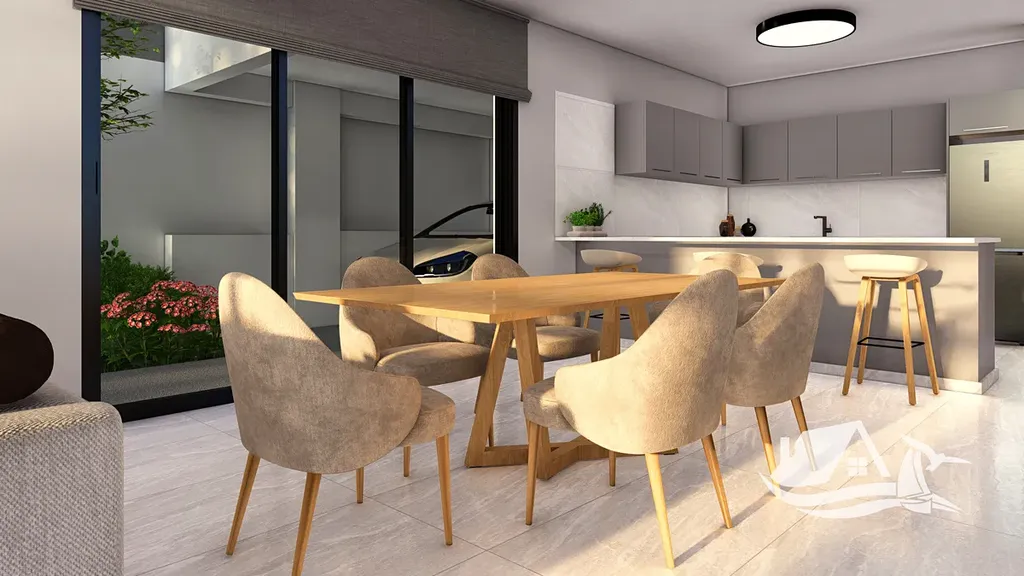 Samotná vila je navržena s důrazem na prostor, eleganci a funkčnost. Otevřená denní část v přízemí vytváří přirozené centrum rodinného života – propojení obývacího pokoje, jídelny a kuchyně působí vzdušně a zároveň prakticky. Velké prosklené plochy zajišťují dostatek světla a propojují interiér s exteriérem, kde se nachází soukromý bazén obklopený terasou a zelení. Tento prostor je ideální pro relaxaci, setkání s přáteli i rodinné chvíle.
