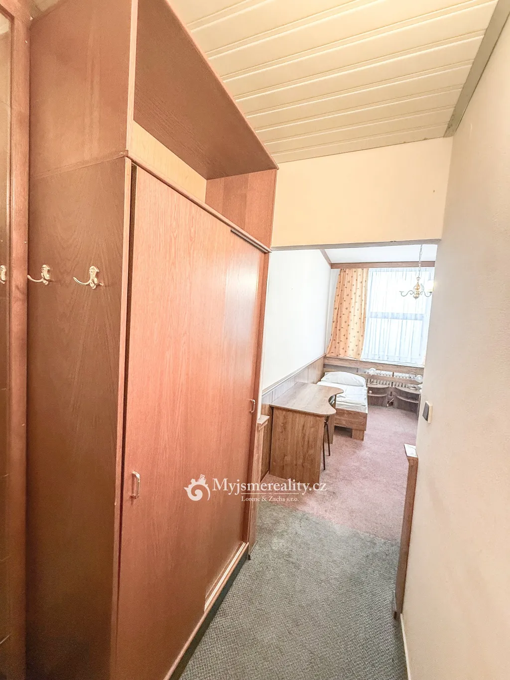 V pokoji je lednička, vestavěné skříně, koupelna se sprchou a WC.