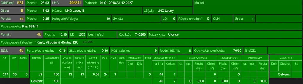- p.č. 989 vedená jako lesní pozemek o celkové výměře 1 701 m2 (stáří lesa 42 let - zastoupení dřevin borovice)
